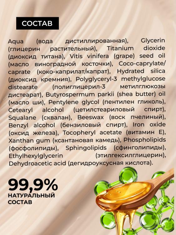 Aqua (вода дистиллированная), Glycerin (глицерин), Titanium dioxide (диоксид титана), Vitis vinifera (grape) seed oil (масло виноградной косточки), Coco-caprylate/caprate (коко-каприлат/капрат), Hydrated silica (диоксид кремния), Polyglyceryl-3 methylglucose distearate (полиглицерил-3 метилглюкозы дистеарат), Butyrospermum parkii (shea butter) oil (масло ши), Pentylene glycol (пентилен гликоль), Cetearyl alcohol (цетилстеариловый спирт), Squalane (сквалан), Beeswax (воск пчелиный), Benzyl alcohol (бензиловый спирт), Iron oxide (оксид железа), Tocopheryl acetate (витамин Е), Xanthan gum (ксантановая камедь), Phospholipids (фосфолипиды), Sphingolipids (сфинголипиды), Ethylhexylglycerin (этилгексилглицерин), Dehydroacetic acid (дегидроуксусная кислота).