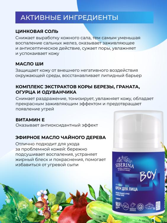 ЦИНКОВАЯ СОЛЬ снижает выработку кожного сала, тем самым уменьшая воспаление сальных желез, оказывает заживляющее и антисептическое действие, сужает поры, увлажняет и успокаивает кожу. МАСЛО ШИ защищает кожу от внешнего негативного воздействия окружающей среды, восстанавливает липидный барьер. ЭКСТРАКТ ЧИСТОТЕЛА известен своими очищающими и бактерицидными свойствами, освежает жирную угреватую кожу, выравнивает и осветляет цвет лица. КОМПЛЕКС ЭКСТРАКТОВ КОРЫ БЕРЕЗЫ, ГРАНАТА, ОГУРЦА И ОДУВАНЧИКА снимает раздражение, тонизирует, увлажняет кожу, обладает прекрасным заживляющим эффектом и предотвращает появление угрей. ВИТАМИН Е оказывает антиоксидантный эффект. ЭФИРНОЕ МАСЛО ЧАЙНОГО ДЕРЕВА отлично подходит для ухода за проблемной кожей: бережно подсушивает воспаления, устраняет жирный блеск и покраснения, помогает избавиться от угревой сыпи.