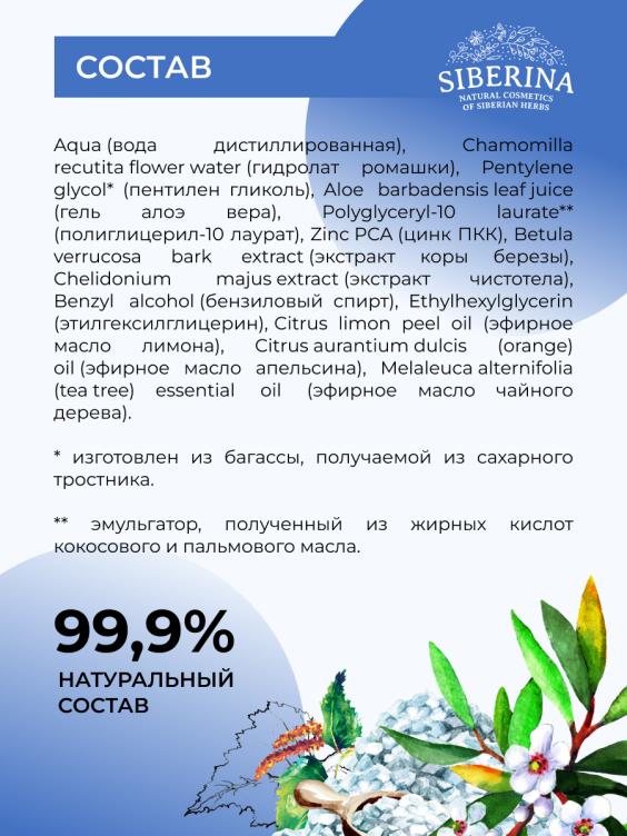 вода дистиллированная (Aqua), гидролат ромашки (Chamomilla recutita flower water), пентилен гликоль* (Pentylene glycol), гель алоэ-вера (Aloe barbadensis leaf juice), полиглицерил-10 лаурат** (Polyglyceryl-10 laurate), цинк ПКК (Zinc PCA), экстракт коры березы (Betula verrucosa bark extract), экстракт чистотела (Chelidonium majus extract), бензиловый спирт (Benzyl alcohol), этилгексилглицерин (Ethylhexylglycerin), эфирное масло лимона (Citrus limon peel oil), эфирное масло апельсина (Citrus aurantium dulcis (orange) oil), эфирное масло чайного дерева (Melaleuca alternifolia (tea tree) essential oil).