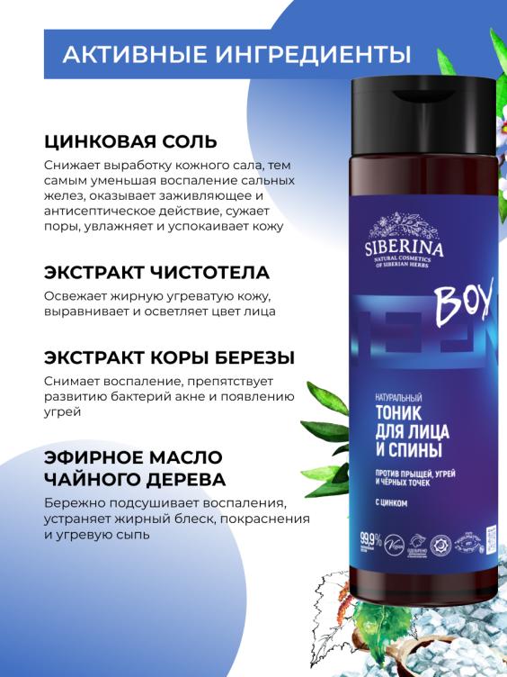 ЦИНКОВАЯ СОЛЬ снижает выработку кожного сала, тем самым уменьшая воспаление сальных желез, оказывает заживляющее и антисептическое действие, сужает поры, увлажняет и успокаивает кожу. ЭКСТРАКТ ЧИСТОТЕЛА известен своими очищающими и бактерицидными свойствами, освежает жирную угреватую кожу, выравнивает и осветляет цвет лица. ЭКСТРАКТ КОРЫ БЕРЕЗЫ обладает мощным противовоспалительным эффектом, препятствует развитию бактерий акне и предотвращает появление угрей. ЭФИРНОЕ МАСЛО ЧАЙНОГО ДЕРЕВА отлично подходит для ухода за проблемной кожей: бережно подсушивает воспаления, устраняет жирный блеск и покраснения, помогает избавиться от угревой сыпи.