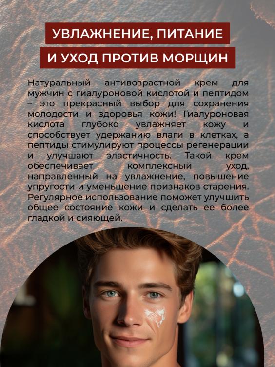 Антивозрастной крем для мужчин с гиалуроновой кислотой и пептидом – это прекрасный выбор для сохранения молодости и здоровья кожи! Такой крем обеспечивает комплексный уход, направленный на увлажнение, повышение упругости и уменьшение признаков старения.