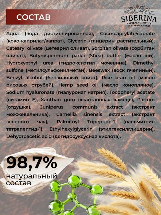 Aqua (вода дистиллированная), Coco-caprylate/caprate (коко-каприлат/капрат), Glycerin (глицерин), Cetearyl olivate (цетеарил оливат), Sorbitan olivate (сорбитан оливат), Butyrospermum parkii (Shea) butter (масло ши), Hydroxyethyl urea (гидроксиэтил мочевина), Dimethyl sulfone (метилсульфонилметан), Beeswax (воск пчелиный), Benzyl alcohol (бензиловый спирт), Rice bran oil (масло рисовых отрубей), Hemp seed oil (масло конопляное), Sodium hyaluronate (гиалуронат натрия), Tocopheryl acetate (витамин Е), Xanthan gum (ксантановая камедь), Parfum (отдушка), Juniperus communis extract (экстракт можжевельника), Camellia sinensis extract (экстракт зеленого чая), Palmitoyl Tripeptide-1 (пальмитоил тетрапептид-1), Ethylhexylglycerin (этилгексилглицерин), Dehydroacetic acid (дегидроуксусная кислота).