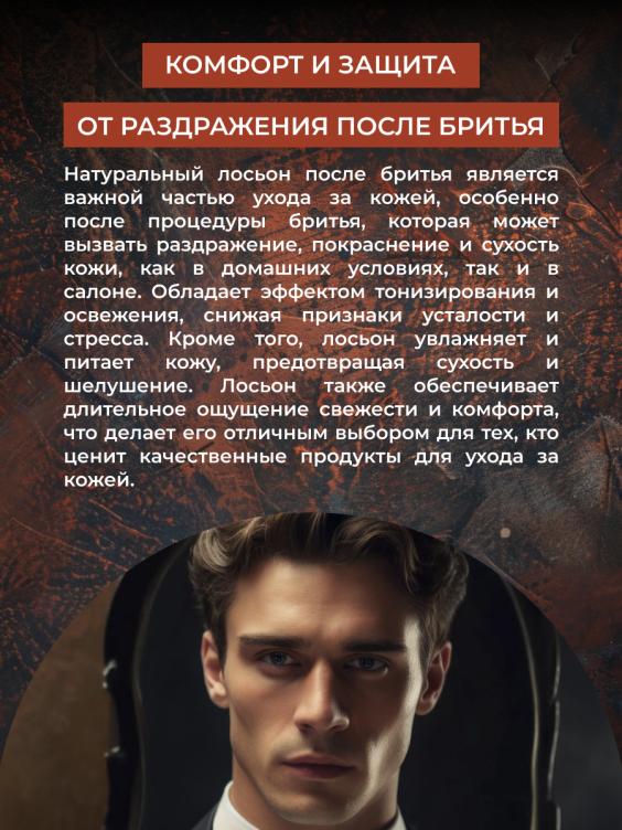 Лосьон после бритья является важной частью ухода за кожей, особенно после процедуры бритья, которая может вызвать раздражение, покраснение и сухость кожи, как в домашних условиях, так и в салоне. Обладает эффектом тонизирования и освежения, снижая признаки усталости и стресса. Кроме того, лосьон увлажняет и питает кожу, предотвращая сухость и шелушение.
