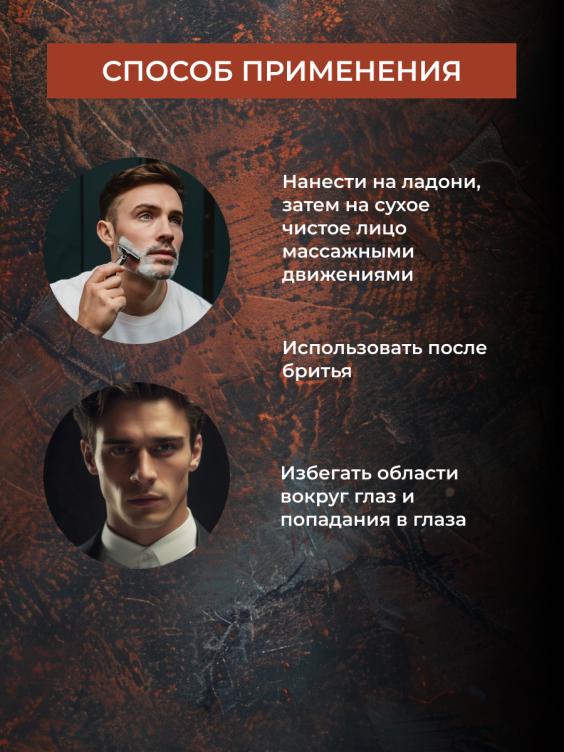Нанести на ладони, затем на сухое чистое лицо массажными движениями. Использовать после бритья. Избегать область вокруг глаз и попадание в глаза.