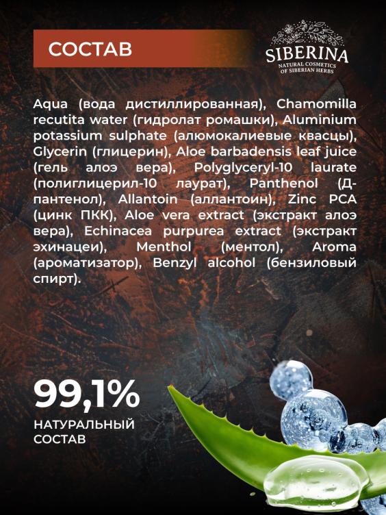 Aqua (вода дистиллированная), Chamomilla recutita water (гидролат ромашки), Aluminium potassium sulphate (алюмокалиевые квасцы), Glycerin (глицерин), Aloe barbadensis leaf juice (гель алоэ вера), Polyglyceryl-10 laurate (полиглицерил-10 лаурат), Panthenol (Д-пантенол), Allantoin (аллантоин), Zinc PCA (цинк ПКК), Aloe vera extract (экстракт алоэ вера), Echinacea purpurea extract (экстракт эхинацеи), Menthol (ментол), Aroma (ароматизатор), Benzyl alcohol (бензиловый спирт).