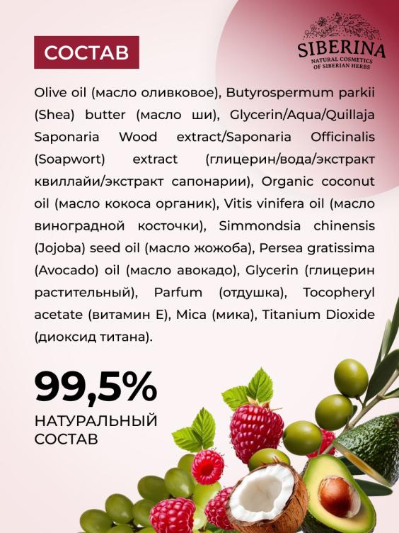 Olive oil (масло оливковое), Butyrospermum parkii (Shea) butter (масло ши), Glycerin/Aqua/Quillaja Saponaria Wood extract/Saponaria Officinalis (Soapwort) extract (глицерин/вода/экстракт квиллайи/экстракт сапонарии), Organic coconut oil (масло кокоса органик), Vitis vinifera oil (масло виноградной косточки), Simmondsia chinensis (Jojoba) seed oil (масло жожоба), Persea gratissima (Avocado) oil (масло авокадо), Glycerin (глицерин), Parfum (отдушка), Tocopheryl acetate (витамин Е), Mica (мика), Titanium Dioxide (диоксид титана).