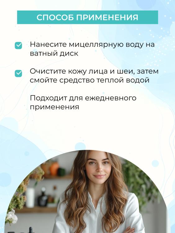 Нанесите мицеллярную воду на ватный диск, очистите кожу лица и шеи, затем смойте средство теплой водой. Подходит для ежедневного применения.