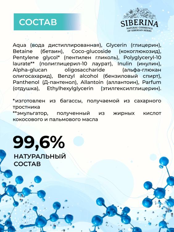 Aqua (вода дистиллированная), Glycerin (глицерин), Betaine (бетаин), Coco-glucoside (кокоглюкозид), Pentylene glycol* (пентилен гликоль), Polyglyceryl-10 laurate** (полиглицерил-10 лаурат), Inulin (инулин), Alpha-glucan oligosaccharide (альфа-глюкан олигосахарид), Benzyl alcohol (бензиловый спирт), Panthenol (Д-пантенол), Allantoin (аллантоин), Parfum (отдушка), Ethylhexylglycerin (этилгексилглицерин). *изготовлен из багассы, получаемой из сахарного тростника.**эмульгатор, полученный из жирных кислот кокосового и пальмового масла.