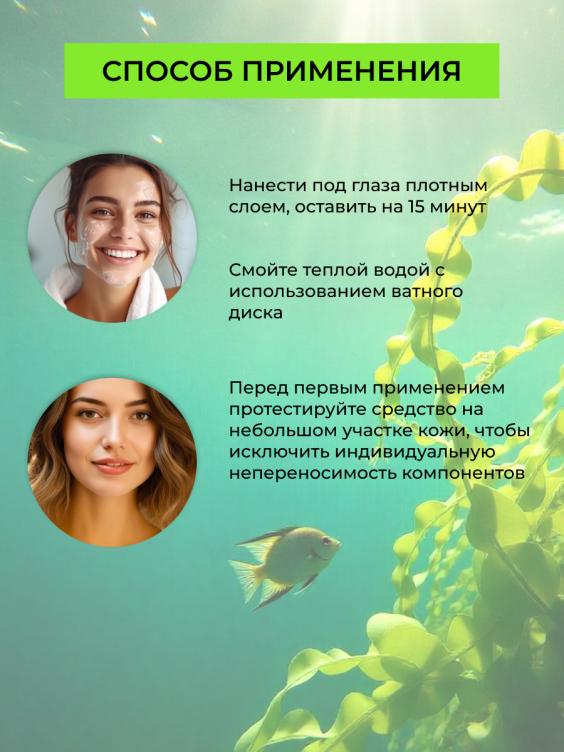 Нанести под глаза плотным слоем, оставить на 15 минут и после смыть водой. Перед первым применением протестируйте средство на небольшом участке кожи, чтобы исключить индивидуальную непереносимость компонентов.
