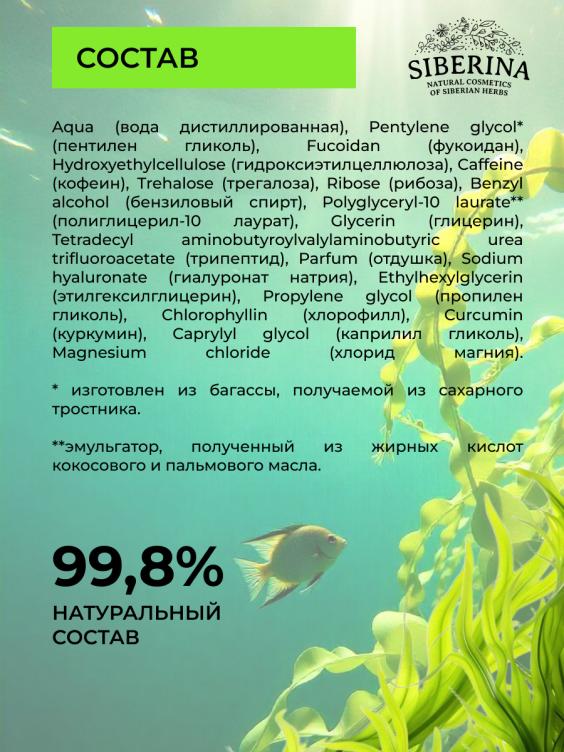 Aqua (вода дистиллированная), Pentylene glycol* (пентилен гликоль), Fucoidan (фукоидан), Hydroxyethylcellulose (гидроксиэтилцеллюлоза), Caffeine (кофеин), Trehalose (трегалоза), Ribose (рибоза), Benzyl аlcohol (бензиловый спирт), Polyglyceryl-10 laurate** (полиглицерил-10 лаурат), Glycerin (глицерин), Tetradecyl aminobutyroylvalylaminobutyric urea trifluoroacetate (трипептид), Parfum (отдушка), Sodium hyaluronate (гиалуронат натрия), Ethylhexylglycerin (этилгексилглицерин), Propylene glycol (пропилен гликоль), Chlorophyllin (хлорофилл), Curcumin (куркумин), Caprylyl glycol (каприлил гликоль), Magnesium chloride (хлорид магния). *изготовлен из багассы, получаемой из сахарного тростника. **эмульгатор, полученный из жирных кислот кокосового и пальмового масла.