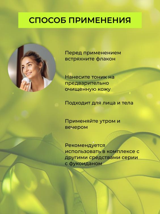 Перед применением встряхните флакон. Нанесите тоник на предварительно очищенную кожу. Подходит для лица и тела. Применяйте утром и вечером. Рекомендуется использовать в комплексе с другими средствами серии с фукоиданом.