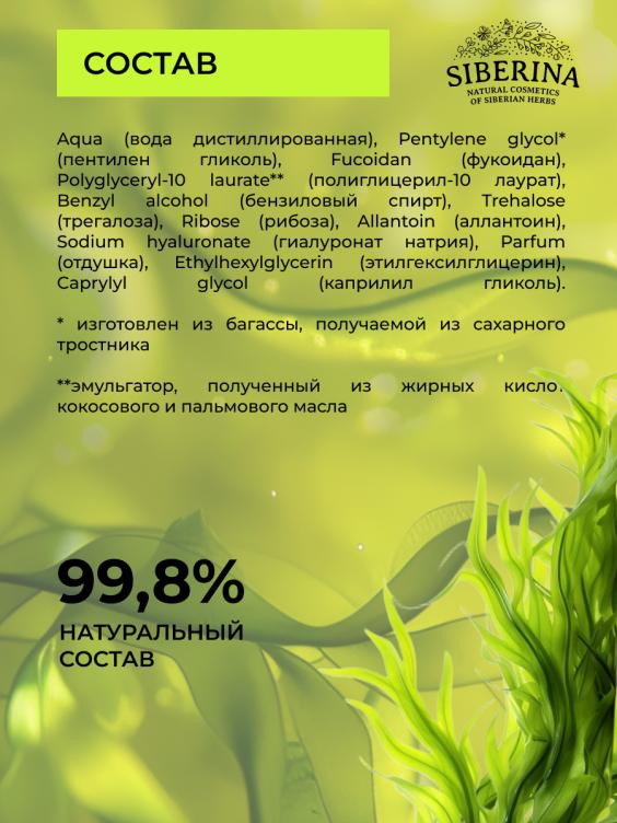 Aqua (вода дистиллированная), Pentylene glycol* (пентилен гликоль), Fucoidan (фукоидан), Polyglyceryl-10 laurate** (полиглицерил-10 лаурат), Benzyl аlcohol (бензиловый спирт), Trehalose (трегалоза), Ribose (рибоза), Allantoin (аллантоин), Sodium hyaluronate (гиалуронат натрия), Parfum (отдушка), Ethylhexylglycerin (этилгексилглицерин), Caprylyl glycol (каприлил гликоль). * изготовлен из багассы, получаемой из сахарного тростника. **эмульгатор, полученный из жирных кислот кокосового и пальмового масла.