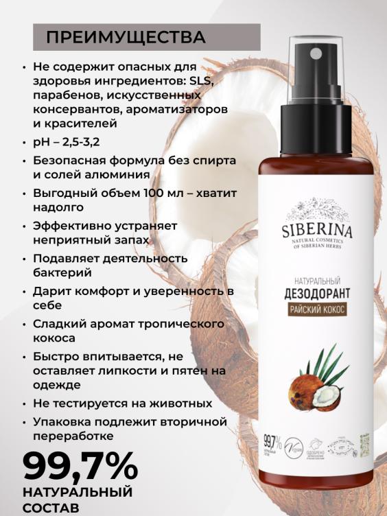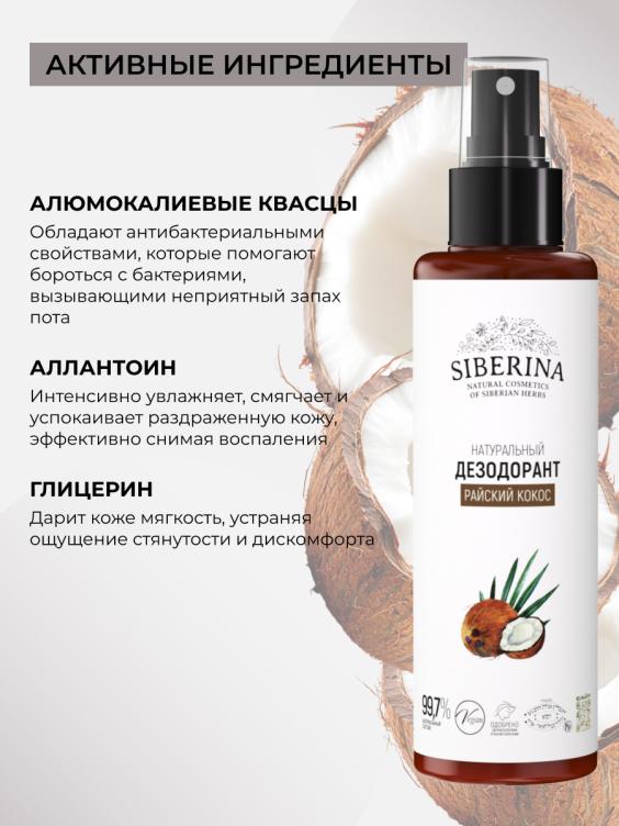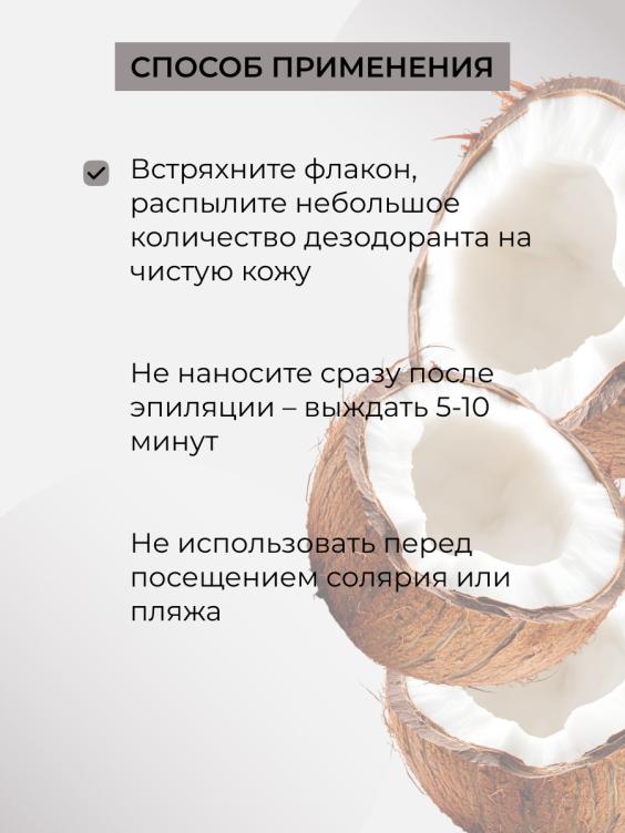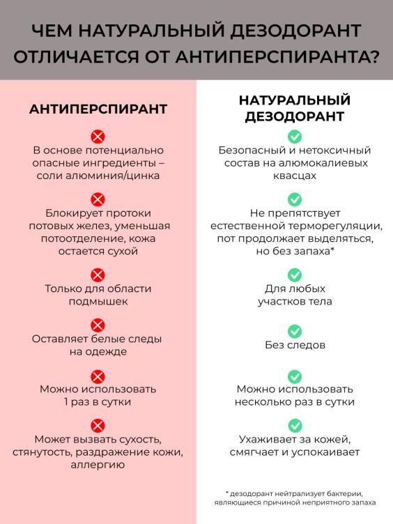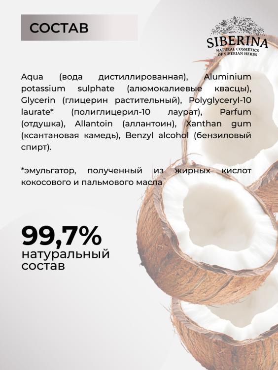 Откройте для себя надежную защиту от запаха пота с нашим натуральным дезодорантом на основе алюмокалиевых квасцов. Он эффективно устраняет неприятные запахи, заботясь о вашей одежде и не оставляя следов. АЛЮМОКАЛИЕВЫЕ КВАСЦЫ обладают антибактериальными свойствами, которые помогают бороться с бактериями, вызывающими неприятный запах пота. АЛЛАНТОИН интенсивно увлажняет, смягчает и успокаивает раздраженную кожу, эффективно снимая воспаления. ГЛИЦЕРИН дарит коже мягкость, устраняя ощущение стянутости и дискомфорта. Наслаждайтесь ароматом кокоса и будьте уверены: никаких следов на вашей одежде.