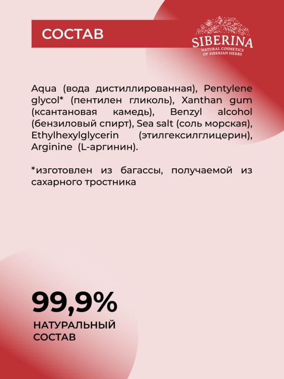Aqua (вода дистиллированная), Pentylene glycol* (пентилен гликоль), Xanthan gum (ксантановая камедь), Benzyl alcohol (бензиловый спирт), Sea salt (соль морская), Ethylhexylglycerin (этилгексилглицерин), Arginine (L-аргинин). *изготовлен из багассы, получаемой из сахарного тростника. Ph – 7.