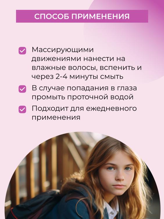 Массирующими движениями нанести на влажные волосы, вспенить и через 2-4 минуты смыть. В случае попадания в глаза промыть проточной водой. Подходит для ежедневного применения.