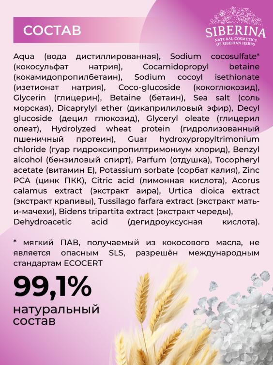 Aqua (вода дистиллированная), Sodium cocosulfate* (кокосульфат натрия), Cocamidopropyl betaine (кокамидопропилбетаин), Sodium cocoyl isethionate (изетионат натрия), Coco-glucoside (кокоглюкозид), Glycerin (глицерин), Betaine (бетаин), Sea salt (соль морская), Dicaprylyl ether (дикаприлиловый эфир), Decyl glucoside (децил глюкозид), Glyceryl oleate (глицерил олеат), Hydrolyzed wheat protein (гидролизованный пшеничный протеин), Guar hydroxypropyltrimonium chloride (гуар гидроксипропилтримониум хлорид), Benzyl alcohol (бензиловый спирт), Parfum (отдушка), Tocopheryl acetate (витамин Е), Potassium sorbate (сорбат калия), Zinc PCA (цинк ПКК), Citric acid (лимонная кислота), Acorus calamus extract (экстракт аира), Urtica dioica extract (экстракт крапивы), Tussilago farfara extract (экстракт мать-и-мачехи), Bidens tripartita extract (экстракт череды),
