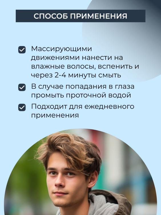 Массирующими движениями нанести на влажные волосы, вспенить и через 2-4 минуты смыть. В случае попадания в глаза промыть проточной водой. Подходит для ежедневного применения.