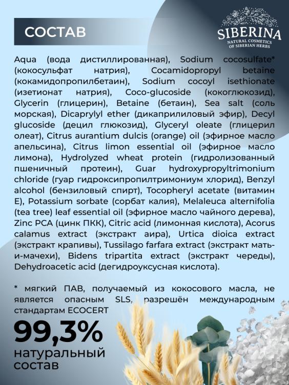 Aqua (вода дистиллированная), Sodium cocosulfate* (кокосульфат натрия), Cocamidopropyl betaine (кокамидопропилбетаин), Sodium cocoyl isethionate (изетионат натрия), Coco-glucoside (кокоглюкозид), Glycerin (глицерин), Betaine (бетаин), Sea salt (соль морская), Dicaprylyl ether (дикаприлиловый эфир), Decyl glucoside (децил глюкозид), Glyceryl oleate (глицерил олеат), Citrus aurantium dulcis (orange) oil (эфирное масло апельсина), Citrus limon essential oil (эфирное масло лимона), Hydrolyzed wheat protein (гидролизованный пшеничный протеин), Guar hydroxypropyltrimonium chloride (гуар гидроксипропилтримониум хлорид), Benzyl alcohol (бензиловый спирт), Tocopheryl acetate (витамин Е), Potassium sorbate (сорбат калия), Melaleuca alternifolia (tea tree) leaf essential oil (эфирное масло чайного дерева), Zinc PCA (цинк ПКК), Citric acid (лимонная кислота), Acorus calamus extract (экстракт аира), Urtica dioica extract (экстракт крапивы), Tussilago farfara extract (экстракт мать-и-мачехи), Bidens tripartita extract (экстракт череды), Dehydroacetic acid (дегидроуксусная кислота).
