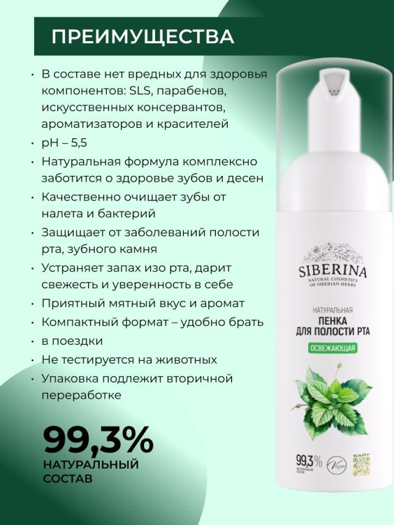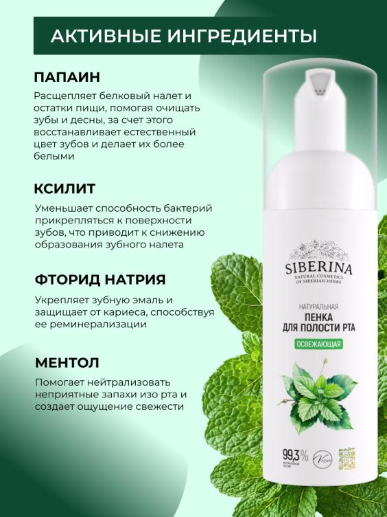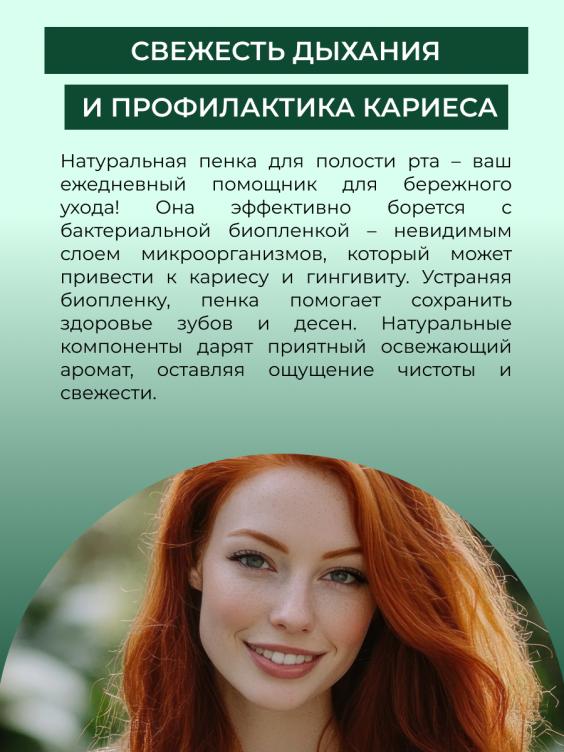 Пенка для полости рта - ваш ежедневный помощник для бережного ухода! Она эффективно борется с бактериальной биопленкой – невидимым слоем микроорганизмов, который может привести к кариесу и гингивиту. Устраняя биопленку, пенка помогает сохранить здоровье зубов и десен. Натуральные компоненты дарят приятный освежающий аромат, оставляя ощущение чистоты и свежести.