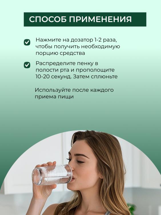 Нажмите на дозатор 1-2 раза, чтобы получить необходимую порцию средства. Подержите пену во рту 10-20 секунд, не глотая. При необходимости не споласкивайте водой после применения. Используйте после каждого приема пищи.