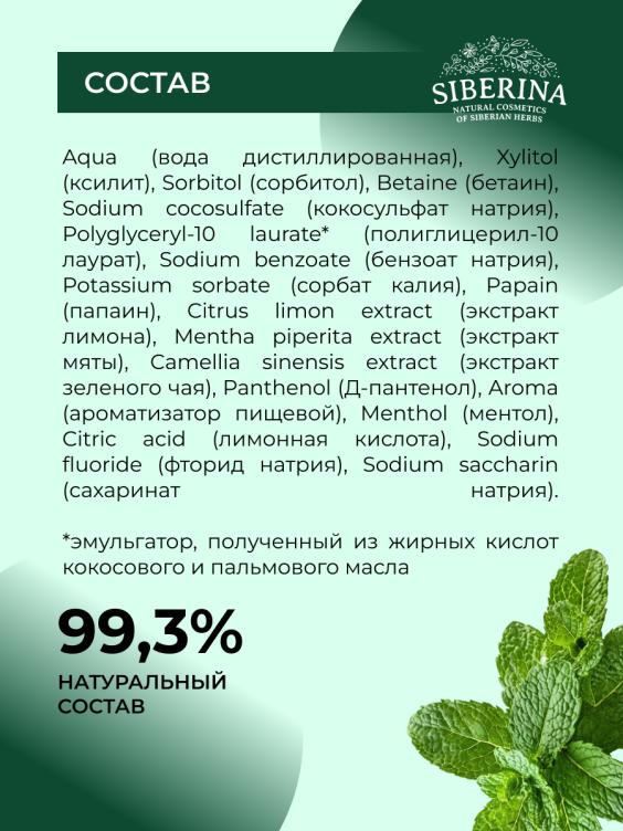 Aqua (вода дистиллированная), Xylitol (ксилит), Sorbitol (сорбитол), Betaine (бетаин), Sodium cocosulfate (кокосульфат натрия), Polyglyceryl-10 laurate* (полиглицерил-10 лаурат), Sodium benzoate (бензоат натрия), Potassium sorbate (сорбат калия), Papain (папаин), Citrus limon extract (экстракт лимона), Mentha piperita extract (экстракт мяты), Camellia sinensis extract (экстракт зеленого чая), Panthenol (Д-пантенол), Aroma (ароматизатор пищевой), Menthol (ментол), Citric acid (лимонная кислота), Sodium fluoride (фторид натрия), Sodium saccharin (сахаринат натрия).