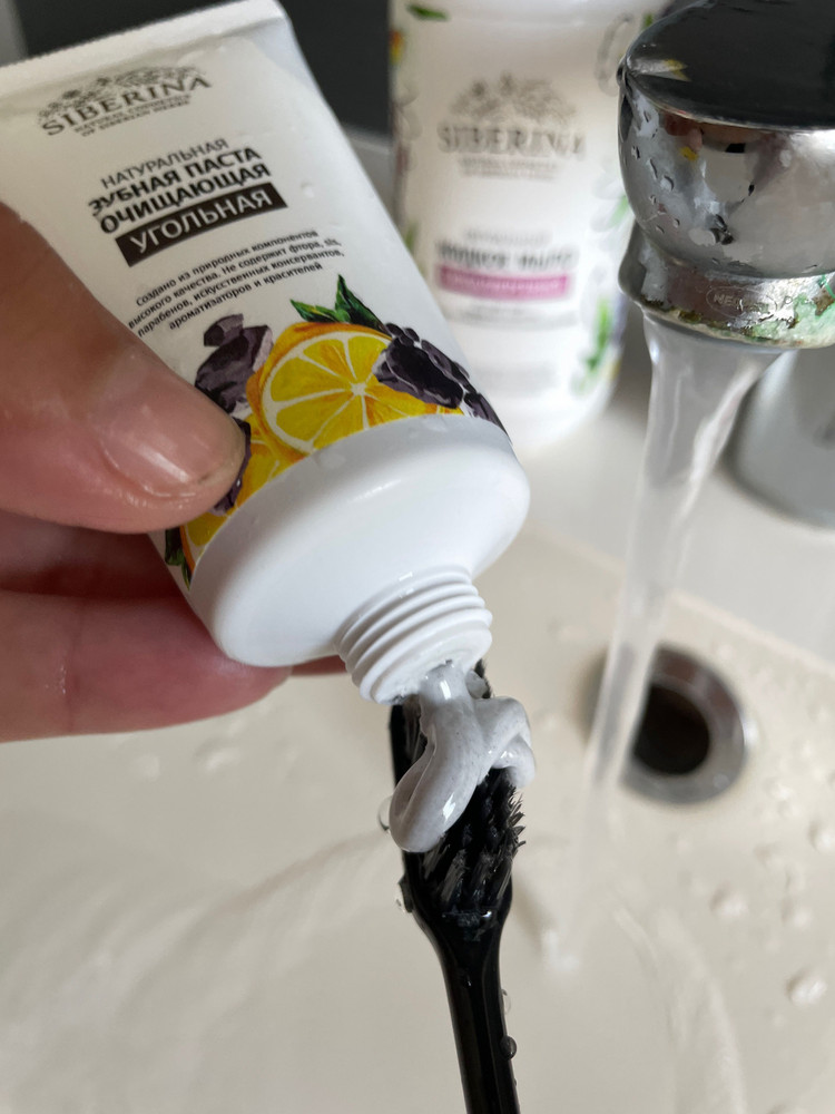 Зубная паста очень оригинальная. Лимон и древесный уголь - цвет пасты немного серый, вкус несколько с горчинкой и привкусом лимонной цедры. Детям така...