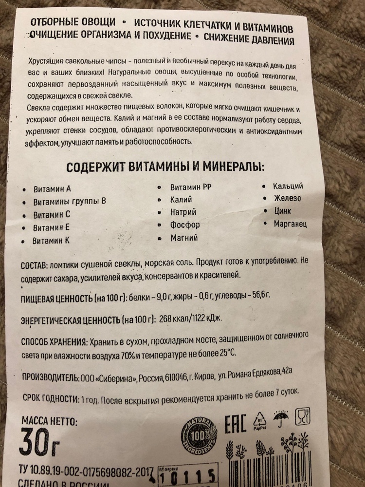 Натуральные овощные чипсы "Свёкла" OCH(2)-SIB