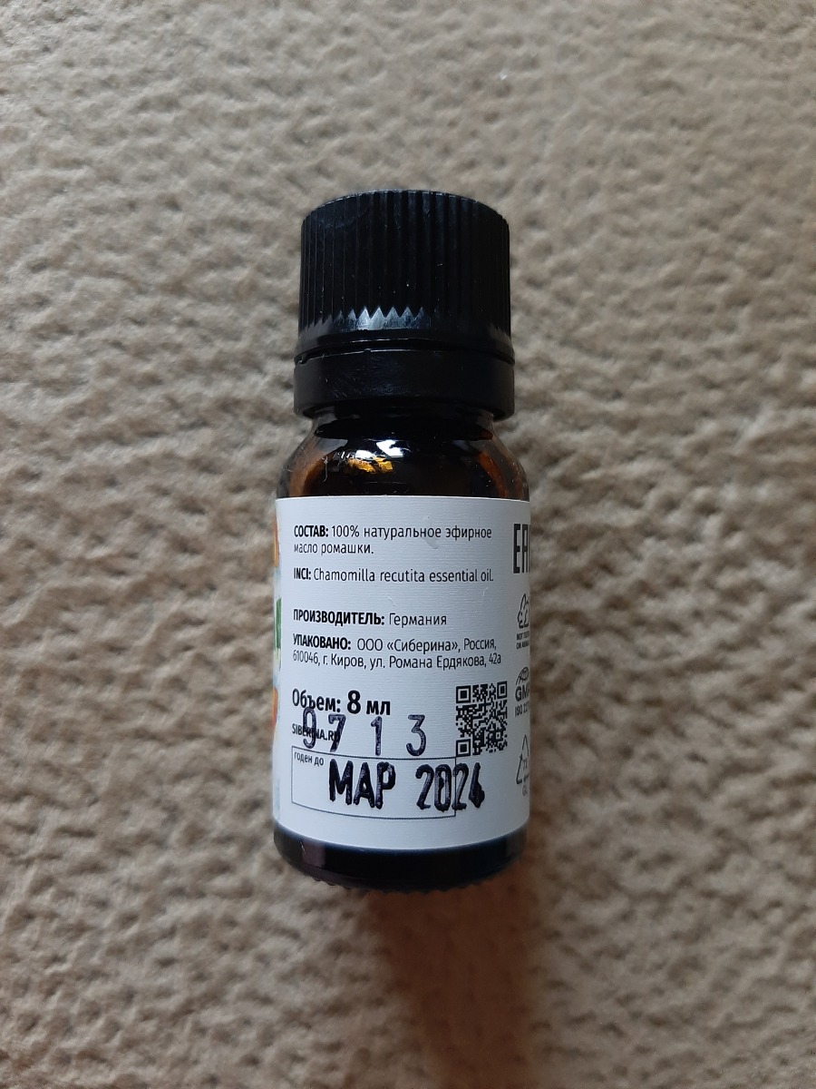Достоинства: Качественное натуральное эфирное масло ромашки. Недостатки: Нет. Эфирное масло хорошего качества, приятный аромат цветов ромашки, конце... Читать полностью...