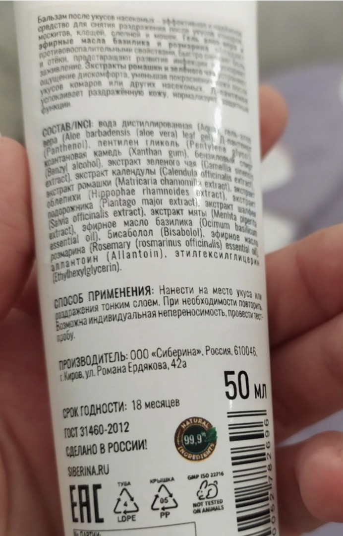 Добрый день! Приятно, что вы выбираете натуральную косметику SIBERINA. Создавая нашу косметику, мы выбираем только качественные, сертифицированные инг...