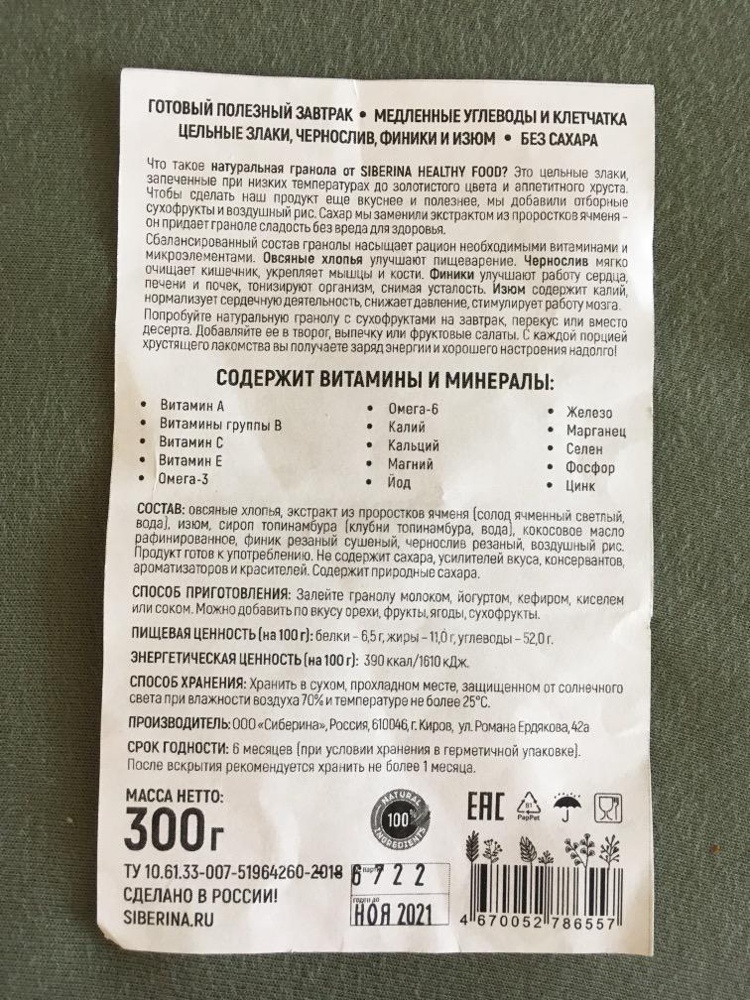 Упаковка удобная с шип-замком. Очень вкусная гранола с полностью натуральным составом. В основе овсяные хлопья, три сухофрукта, кокосовое масло и возд...