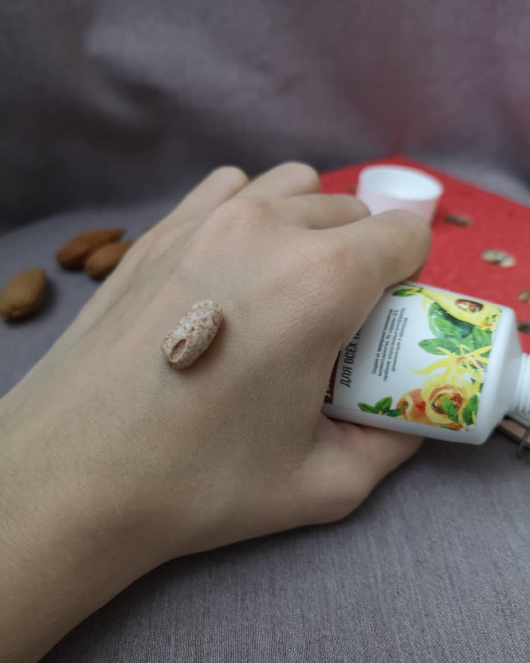 Скраб с лёгкостью крема распределяется по лицу и шее. Частицы бережно скользят, не причиняя дискомфорт. Он не пенится, смывается без труда.