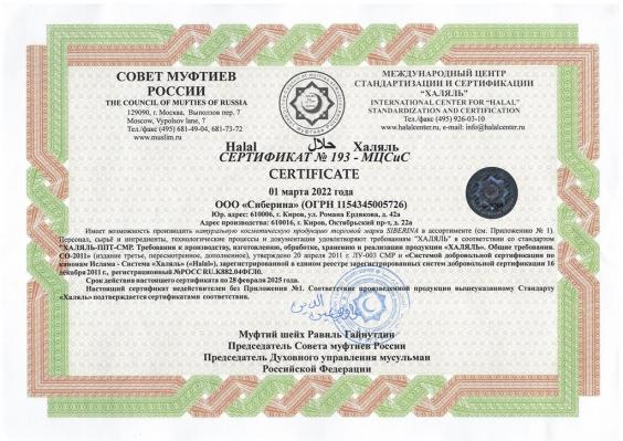 Мы прошли сертификацию в Международном центре стандартизации и сертификации «ХАЛЯЛЬ» – единственной в РФ организации, получившей полномочия на осуществление деятельности по сертификации продукции и услуг «ХАЛЯЛЬ» от духовного управления мусульман. Результаты проверки подтвердили: косметика SIBERINA соответствует высоким стандартам, установленным исламским законом, является экологически чистой, безопасной и создается с заботой о природе и здоровье человека.