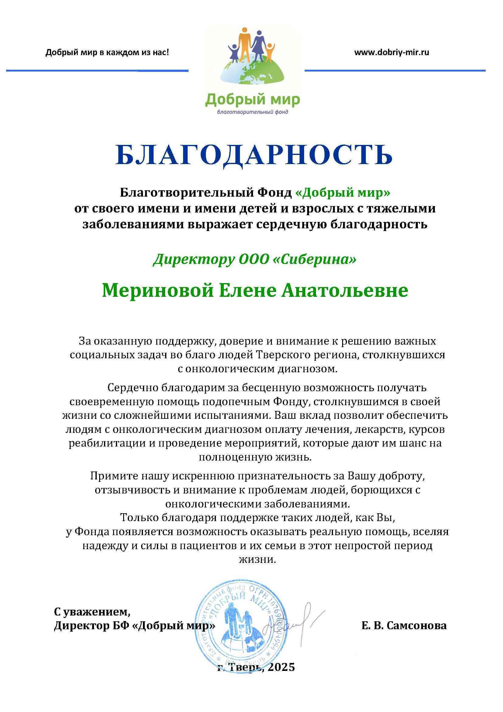 Благотворительный Фонд «Добрый мир» от своего имени и имени детей и взрослых с тяжелыми заболеваниями выражает сердечную благодарность Директору ООО «Сиберина» Мериновой Елене Анатольевне.